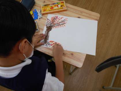 秋の虫や紅葉など、秋を連想させるものを自由に描きました。クレパスで力強く色を塗りこんで、秋らしい絵をたくさん描くことができました。