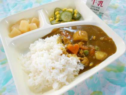 本日の給食では、一口の大きさに切った缶詰の「白桃」が出ています。