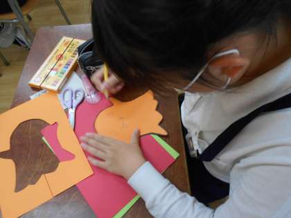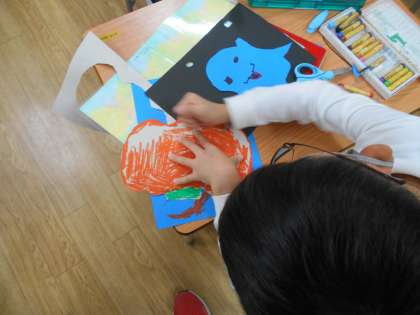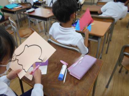 画用紙を切ったり貼ったりしておばけの形を作り、色鉛筆やクレパスでおばけの顔や体を描きました。