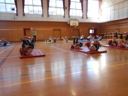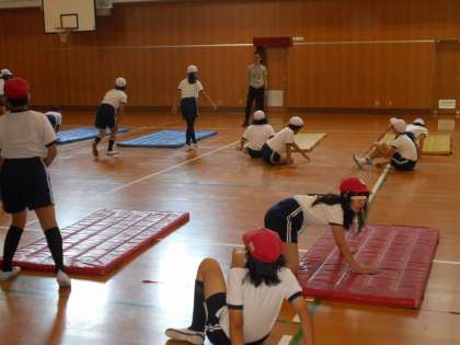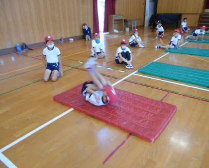 おへそを見ながら体を丸めることやあごを引くこと、お尻・腰・背中の順番でマットにつくことなど体の使い方を意識しながら、後転に取り組みました。