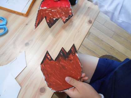 たまごからいろいろな生き物が飛び出してくるという題材の作品を作りました。