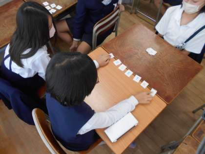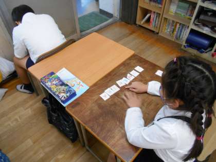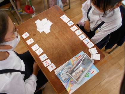 ペアになって、机の上に並べられたカードから、どのアルファベットのカードがなくなったのかを探すゲームをしました。