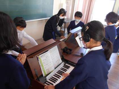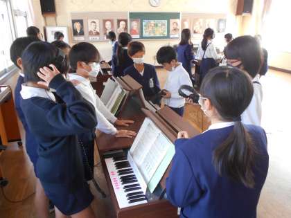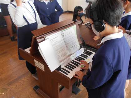 グループでメロディー・和音・低音の役割に分かれて、「静かにねむれ」をオルガンで練習しました。