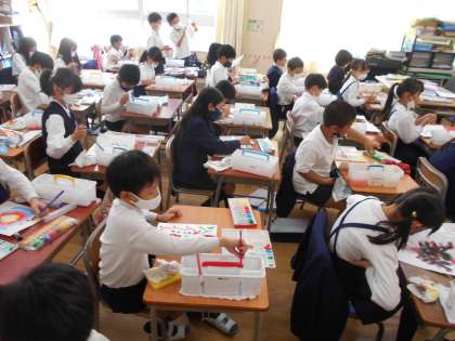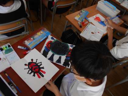 画用紙の半分に絵の具で模様を描き、画用紙を折って開くと左右対称の模様ができる「デカルコマニー」という技法で「新種の生き物」を描きました。