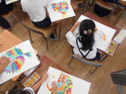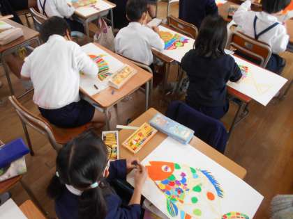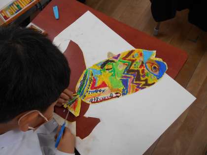 うろこの部分をいろいろな色のクレパスで丁寧に塗り込み、色鮮やかな魚を描くことができました。