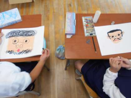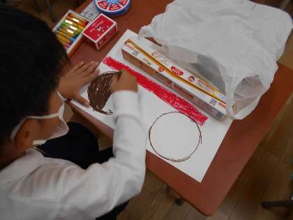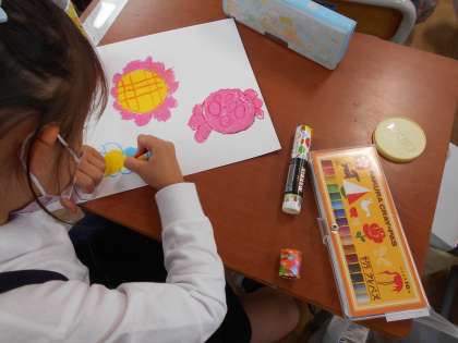 箱の形をよく見て、組み合わせを考えて車や花、先生の顔などを描くことができました。