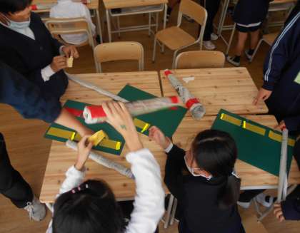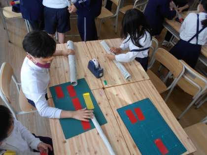 ずれないように新聞紙を丸めて、テープで固定し、真っすぐな棒ができました。