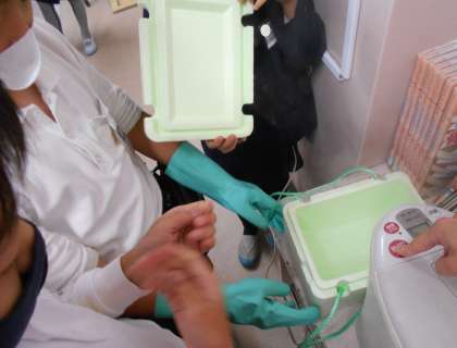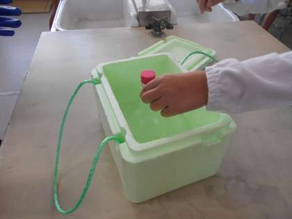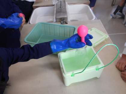 栓をしたフラスコや、風船を付けたペットボトルを熱湯につけるとどうなるかを調べる実験をしました。