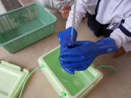 水を満杯にしたフラスコを熱湯や氷水につけて、水位がどのように変化するのかを調べました。