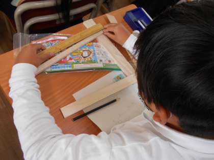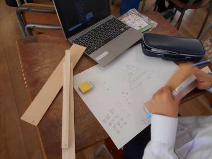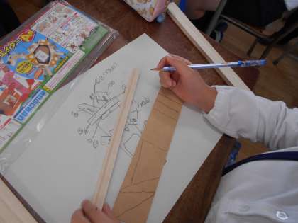 実際に木片を組み合わせながら木片をどのくらいの長さに切るのか、どこに何色をぬるのかなどを考えながら設計図を描くことができました。