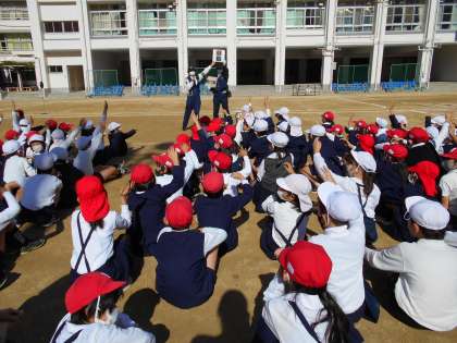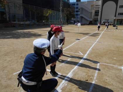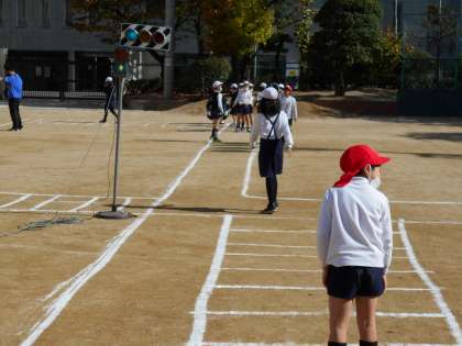 東警察署交通課のおまわりさんと中央区役所の方が来て、交通安全についてのお話を聞きました。「止まれ」の標識では止まって左右を見ることや、道路のどこを通れば安全なのかを教えてくださいました。そして、実際に運動場に描いた模擬道路で、道路の右側を歩いたり、左右に気を付けて信号を渡ったりする練習をしました。