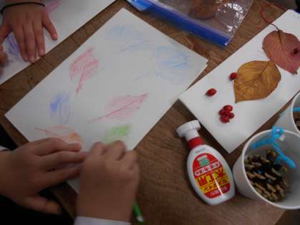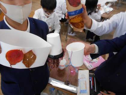 そして、拾った落ち葉やどんぐりを使っておもちゃ作りをしました。