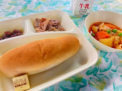 今日の給食の「うずら豆のグラッセ」は、砂糖と塩で味付けし、バターの代わりにオリーブ油でつやを出しています。