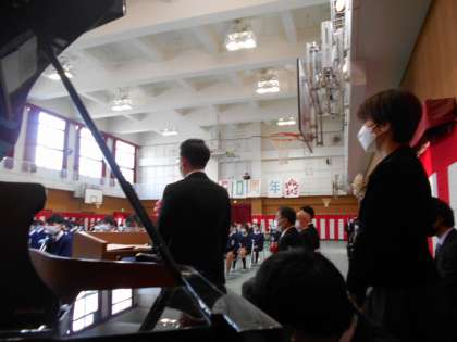 6年生が南大江の児童代表として式典に参加し、1年生から5年生はTeams配信で各教室から式典の様子を見ながら参加しました。