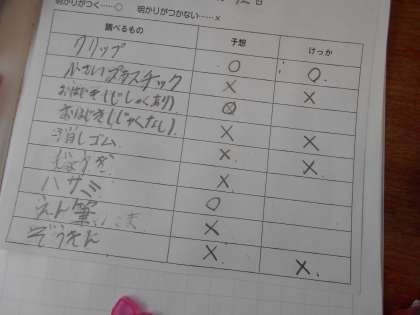 鉛筆、クリップ、水筒、消しゴム、アルミホイル、1円玉などを調べ、電気を通すものと通さないものに分けることができました。