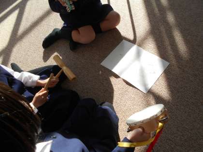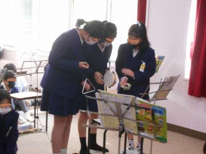 タンブリンやカスタネット、マラカス、ウッドブロックなどいろいろな打楽器を使って演奏をしました。
