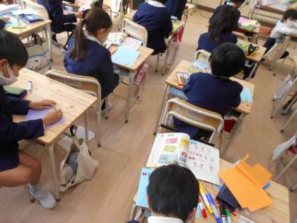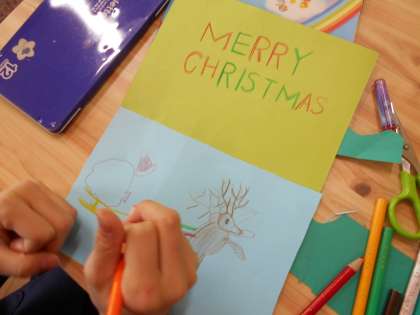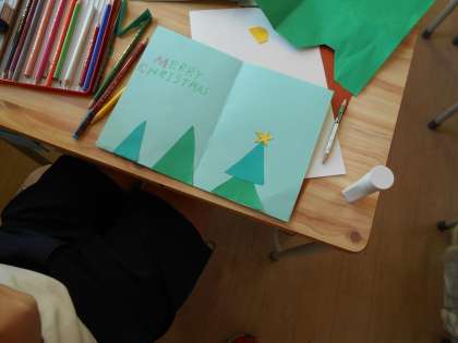 「Merry Christmas」などの言葉を書き、グリーティングカードを作りました。