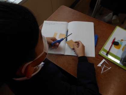 平行四辺形を切り貼りすると、長方形ができることに気づき、いろいろな形の長方形を作って面積を求めることができました。
