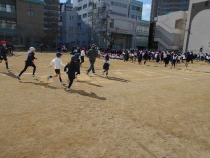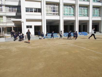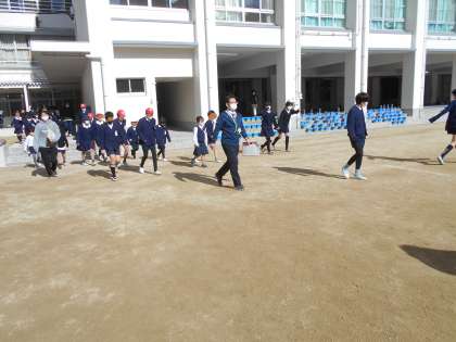 「揺れが収まりました。」という放送が流れると、全児童が先生の誘導で運動場に避難しました。