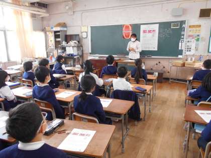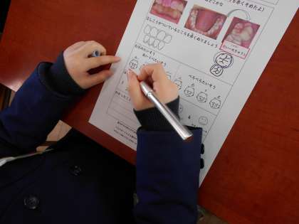歯科衛生士の方々が学校に来て、歯磨きのしかたを教えてくれました。