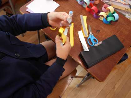 「たてわり班活動」では、1年間班のみんなを引っ張ってくれた6年生に向けて、メッセージカードや教室の飾りを作りました。