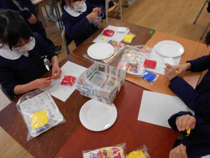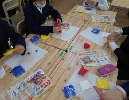 赤・青・黄・白の色がついた紙粘土を使って、マグネットを作りました。