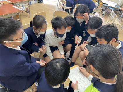 6年生が好きなものが問題になっています。班のみんなで考えてマスをうめました。