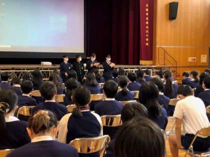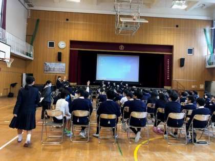 東中学校の、生徒会とESS部の皆さんが、中学校の学校生活について話しに来てくれました。