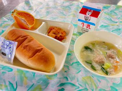 給食の「中華がゆ」は、米のほかに、肉団子、大根、チンゲンサイ、にんじん、しいたけが入っています。