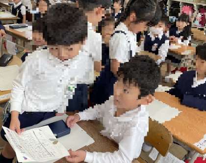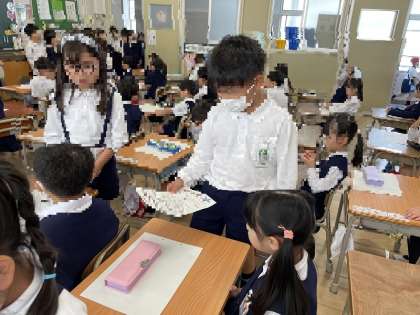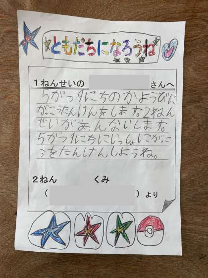 2年生が1年生へ、学校たんけんの招待状を渡しに来てくれました。