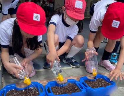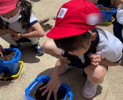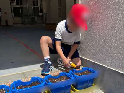 アサガオの種まきをしました。先生の説明をきちんと聞き、土を平らにしたり穴を開ける深さに気を付けたりして種をまくことができました。