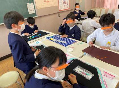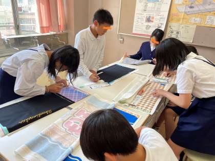 定規を使って 裁ち切り線 折り線 できあがり線の3本の線を引きます。まっすぐ引くのが難しく苦戦していた人もいましたが、グループで協力して引くことができました。