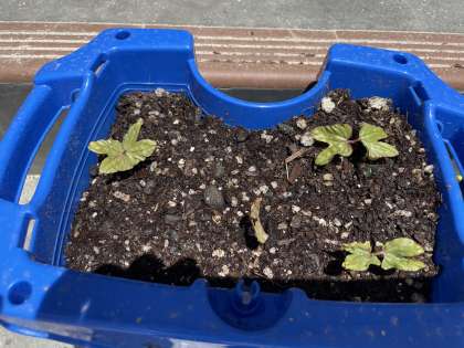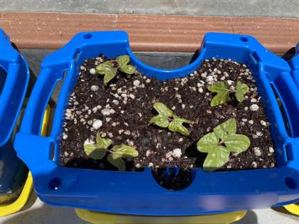 朝、いつものように水やりに行くと、あさがおの芽が出ていました。