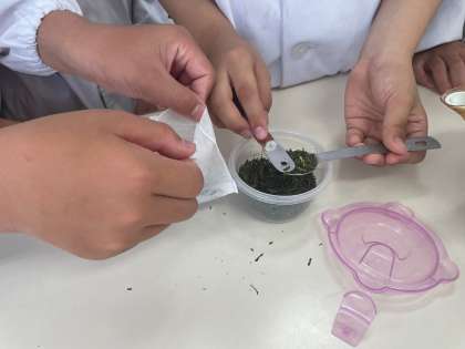 計量スプーンでお茶を計るのが難しそうでしたがグループで協力しておいしいお茶を入れることができました。