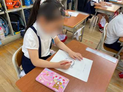 ランドセルの絵に、自分の好きな色一色を塗りました。子どもたちは赤や青、紫など自分の好きな色を塗っていました。