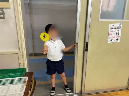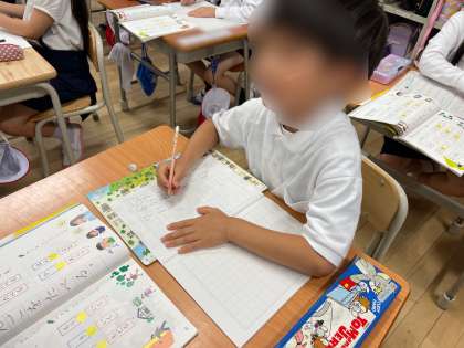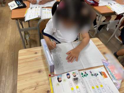 「を」を使った文を考える活動では、「ドアをしめる。」「ノートをひらく。」などの文を作ることができました。「を」は言葉にくっつく、文の最初には書かないということが理解できました。