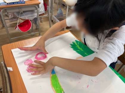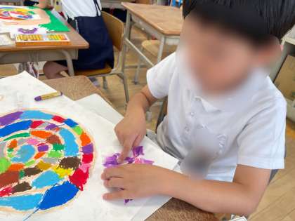 画用紙を花びらの形に切り抜き、内ぼかしという技法を使ってあじさいを描きました。指でぼかしたとき、普段とは違うパスの発色を見て子どもたちは大喜びでした。