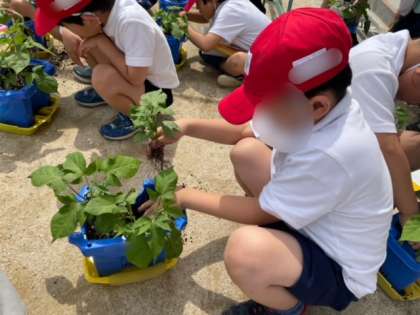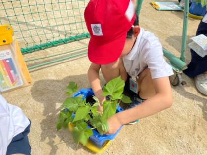 朝顔の本葉が大きくなり、ツルが伸び始めてきました。丸い葉やぎざぎざしている葉を見て、「はっぱの形がちがう!」と気づく子もいました。