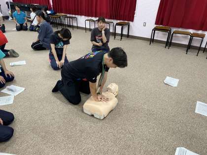 救急救命講習の様子です。実際の手順など一つ一つ確認しながら取り組みました。