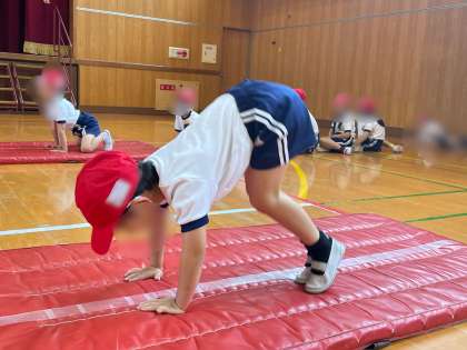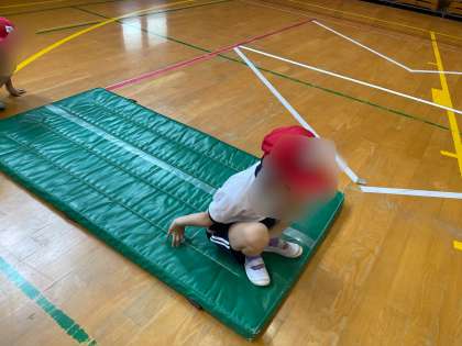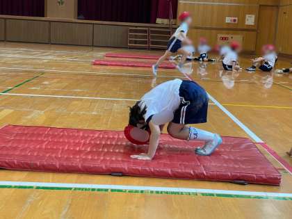 かえるの足うちでは、両手をしっかりマットに付き、足を高く上げて3回叩くことを目標に頑張りました。前転は、おへそを見ることを意識して回ることができました。