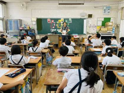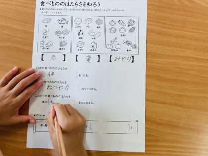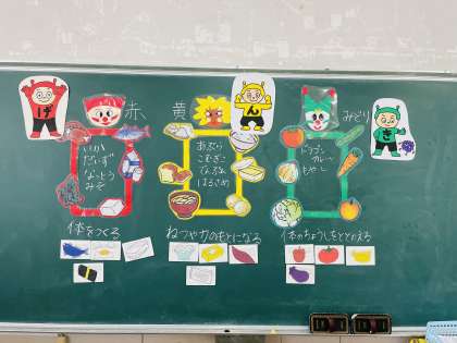 栄養教諭から栄養のことを教えていただきました。赤、黄、緑の3色に分けられることや3つの色を合わせて食べるとどうなるかを知りました。食事をするときは、どんな食べ物が何色の仲間になるかを考えながら食べてみましょう。
