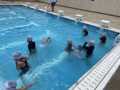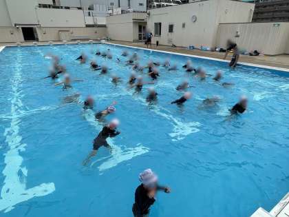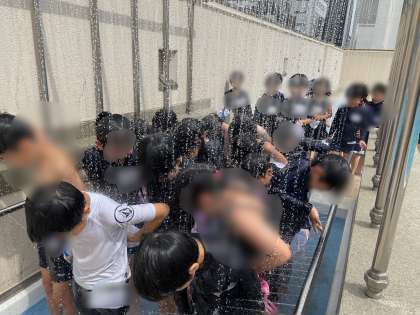 シャワーにも慣れ、「気持ちいい!」と言っていました。ダンスをした後は、クラス対抗で宝探しをしました。第1回宝探しの結果は……2組が勝ちました。「次は勝つぞ!」と1組の子も気合いを入れていました。