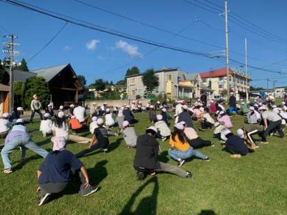 朝の光をたっぷり浴びながら、保健係が主となり、自然の中で体操をしました。