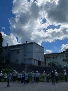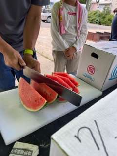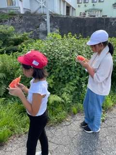 駐車場の端っこに一列に並んで食べています。スイカのタネを草むらに向かって飛ばすために!