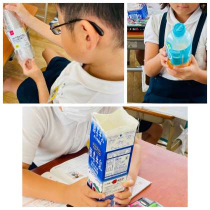 身の回りにあるもの(ペットボトルや絵の具など)のラベルを見て、「mL」を探す活動をしました。