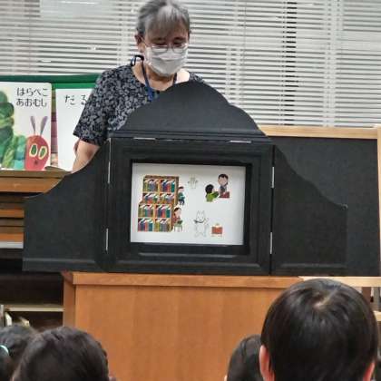 図書館の探検では、タブレットで図書館の様子の写真を撮ったり好きな本を探したりしながら、グループで楽しく活動することができました。多目的室では、図書館についての紙芝居を見せて頂いたり質問をさせて頂いたりしました。