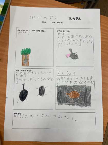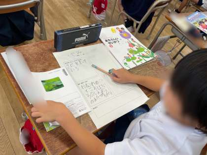 教科書や図鑑から好きな生き物を選び、新聞づくりをしています。教科書や図鑑をすみずみまでよく読み、すんでいる場所や好きな食べ物、オスとメスのちがいなどを上手にまとめることができました。