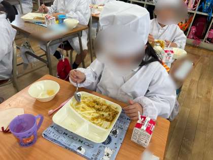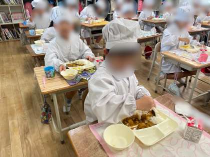 今日の給食はカレーライスです。みんなが自分が決めた量を完食できるよう、頑張りカードを作っています。完食したらはんこ、全員が決められた時間に完食できたらシールを貼っています。