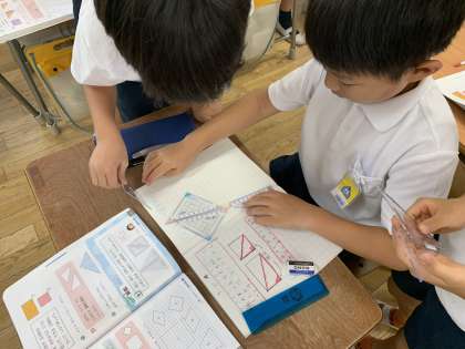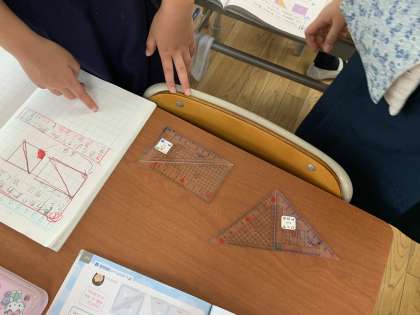 自分と友だちの三角定規を合わせて、いろんな三角形や四角形を作りました。