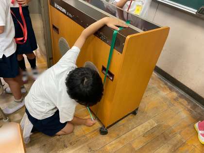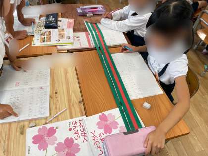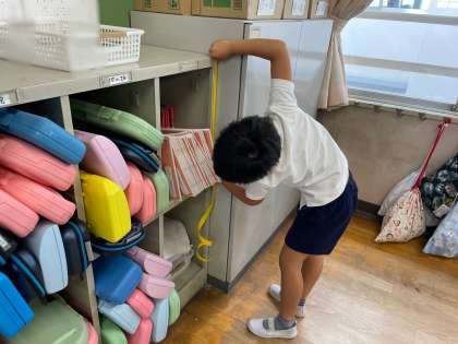紙テープを使って、机の横やロッカーの高さなどいろいろな物の長さを測りました。班に分かれてそれぞれのテープの長さを比べ、何が一番長かったかを調べました。班のみんなで協力して活動できました。